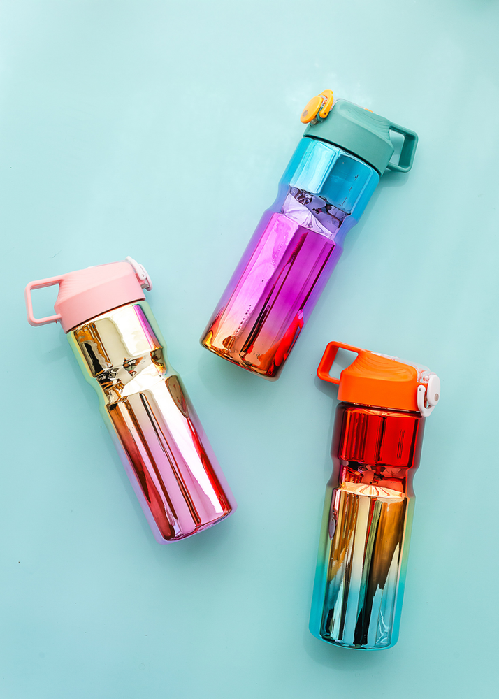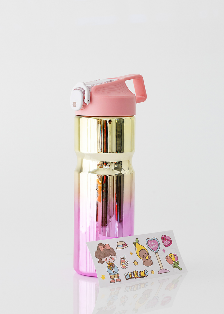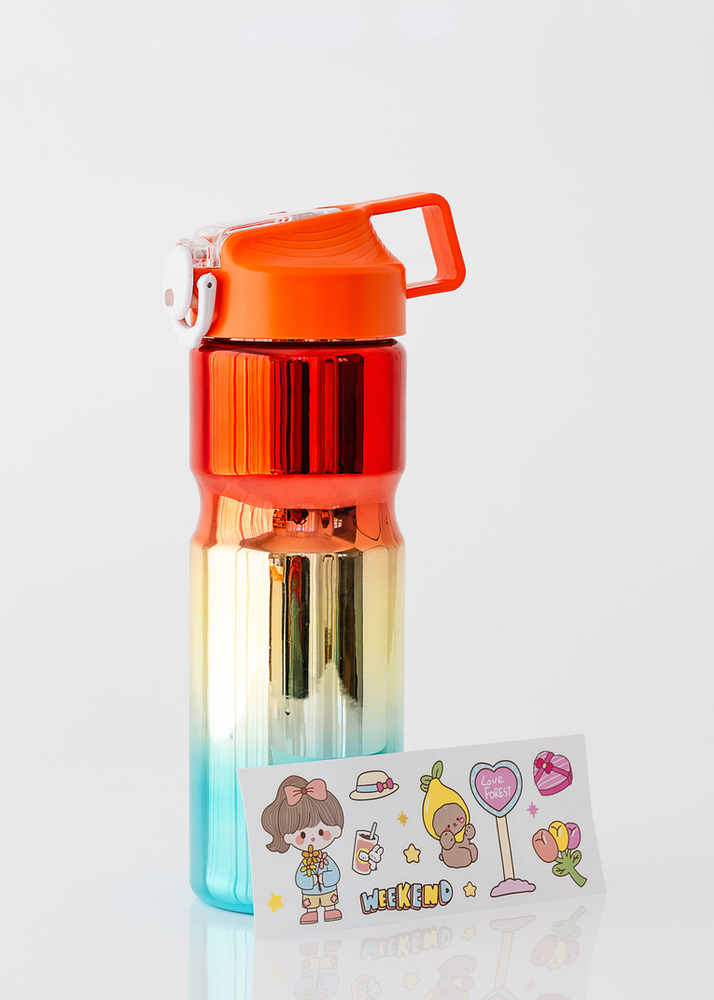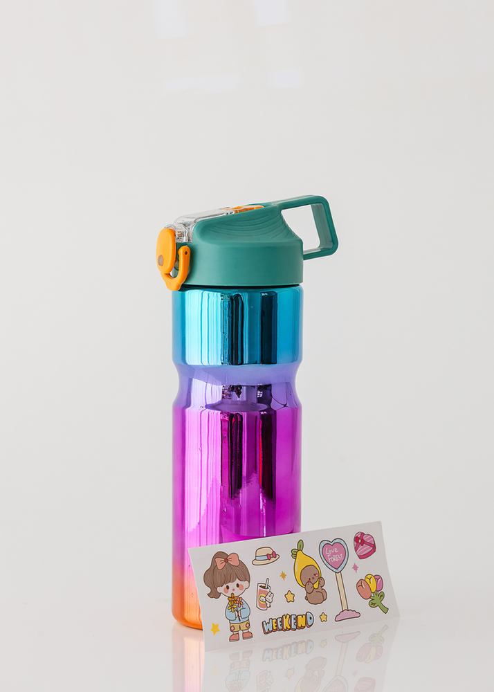 BOTELLA DE PLASTICO TORNASOLADA CON PICO DE SILICONA Y TRABA DE PLASTICO. TRAE TAMBIEN STICKERS EN EL INTERIOR PARA QUE LA PUEDAS DECORAR A TU MANERA.