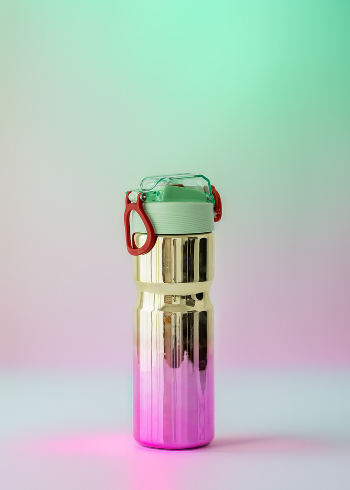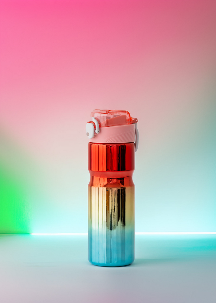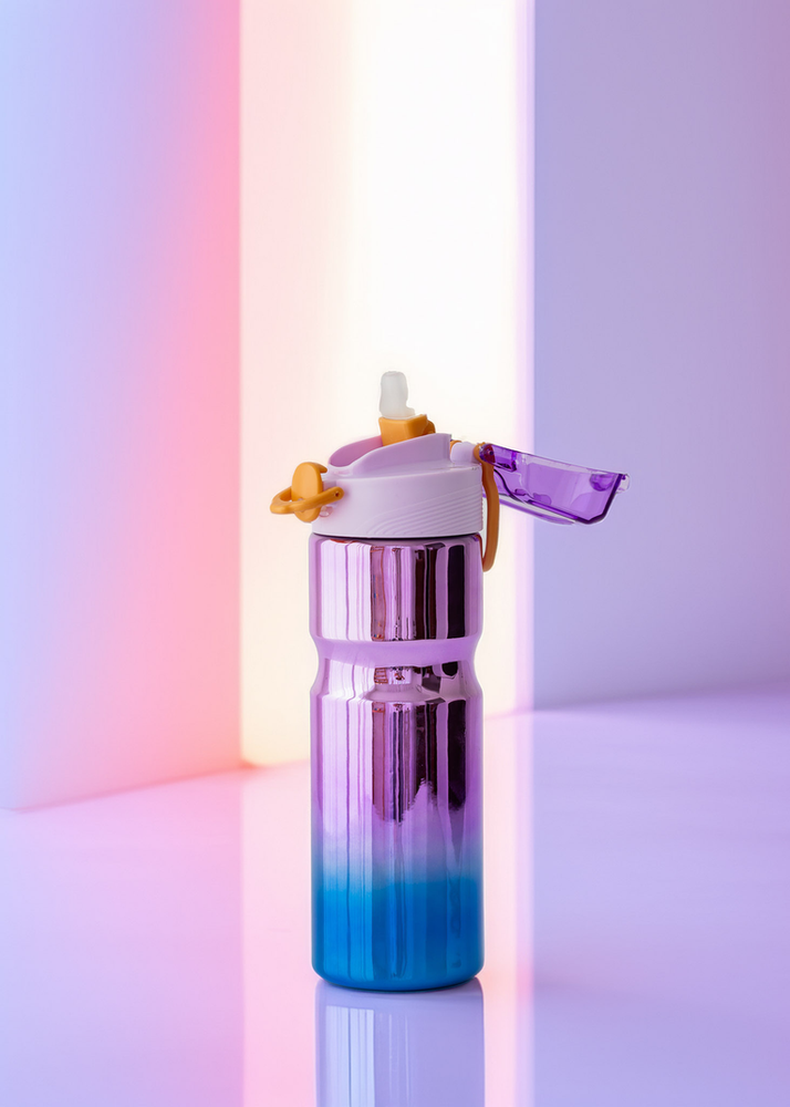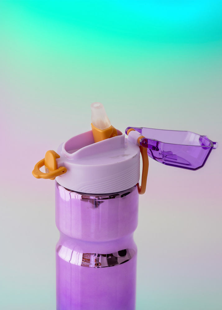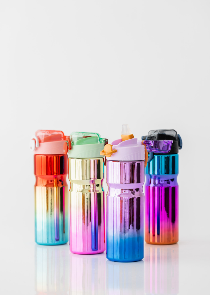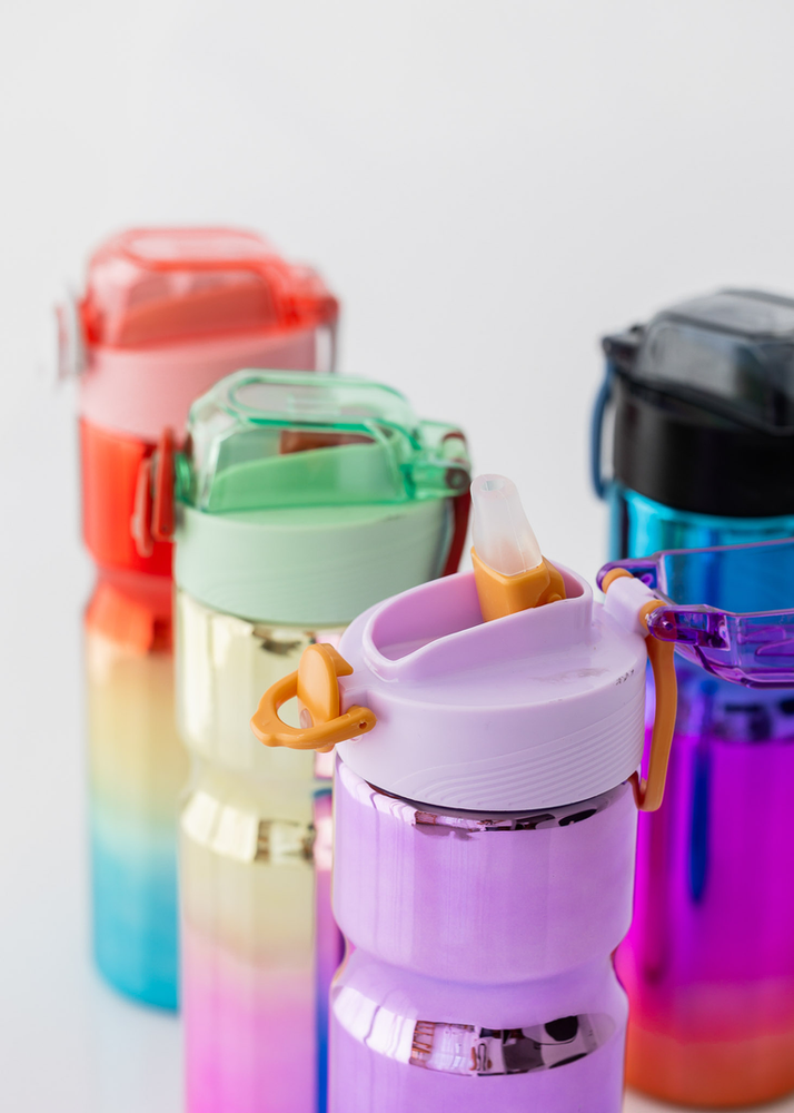 BOTELLA DE PLASTICO TORNASOLADA CON PICO DE SILICONA Y TRABA DE PLASTICO. TRAE TAMBIEN STICKERS EN EL INTERIOR PARA QUE LA PUEDAS DECORAR A TU MANERA.