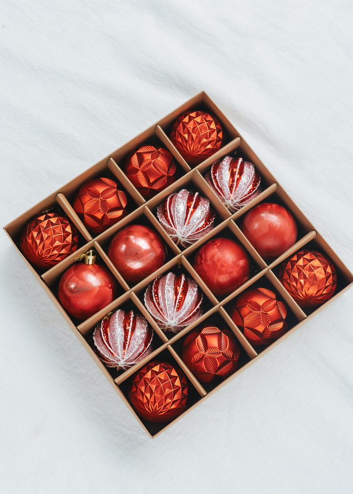 CAJA POR 16 UNIDADES DE BOLAS DECORATIVAS PARA COLGAR NAVIDEÑA.