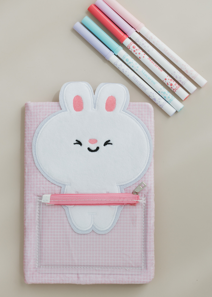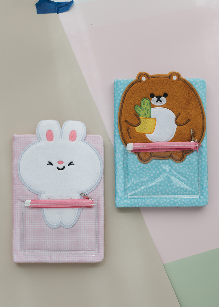CUADERNO CON HOJAS RAYADAS , DE TAPA DURA Y CON UNA MINI CARTUCHERA PLASTICA EN LA PARTE DE ENFRENTE. VIENEN DOS DISEÑOS.