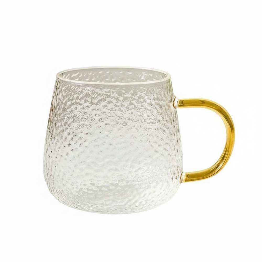 TAZA DE VIDRIO TRANSPARENTE CON ASA EN COLOR DORADO. UNICO MODELO.