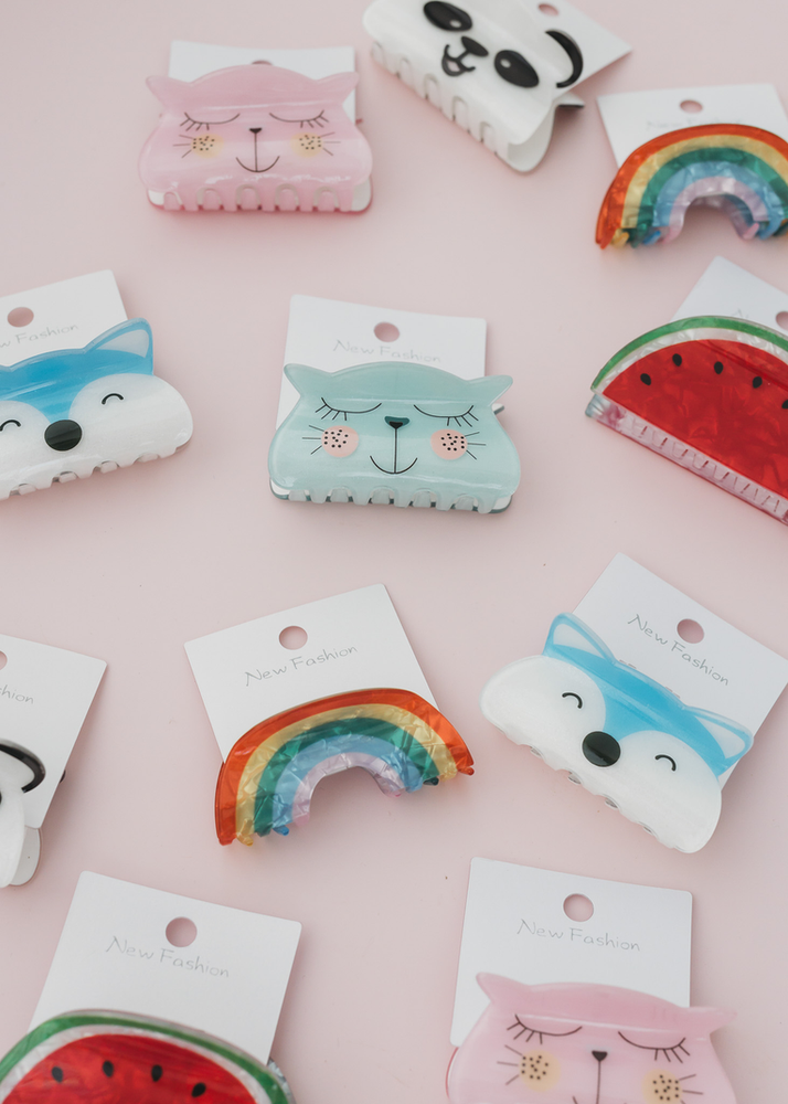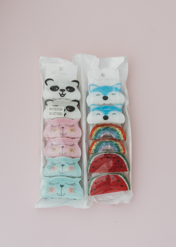 BOLSA POR 12 UNIDADES DE HEBILLAS ACRILICAS CON DISEÑOS SURTIDOS.