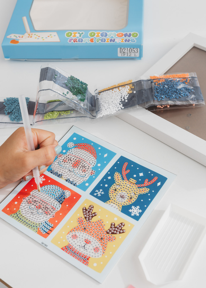 KIT DIAMONT ART NAVIDEÑOS. INCLUYE UNA LAMINA , UTENSILLOS, DIAMANTES Y UN MARCO PLASTICO PARA EXHIBIR LA OBRA FINAL.