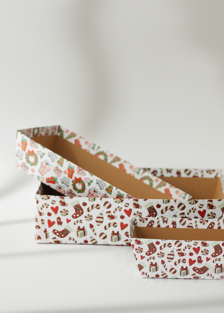 BANDEJAS DE CARTON CON DISEÑOS NAVIDEÑOS PARA ORGANIZAR ESPACIOS O PARA LLENAR DE DECORACIONES.