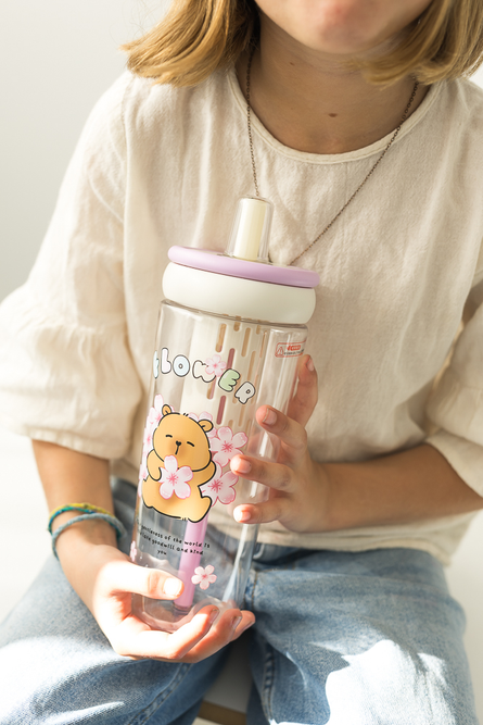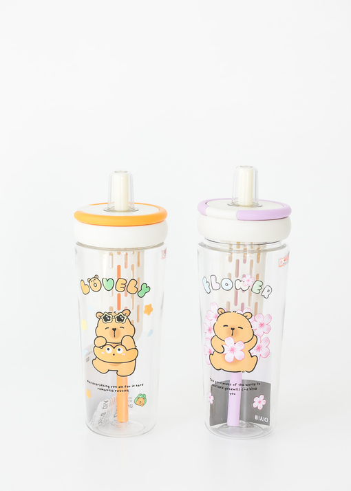 VASO DE PLASTICO (1000ml) DE CAPYBARA CON SORBETE PLASTICO , MANIJA Y EN SU INTERIOR TIENE UN ACCESORIO PARA PONER FRUTAS Y SABORIZAR EL AGUA. VIENE EN DOS COLORES.