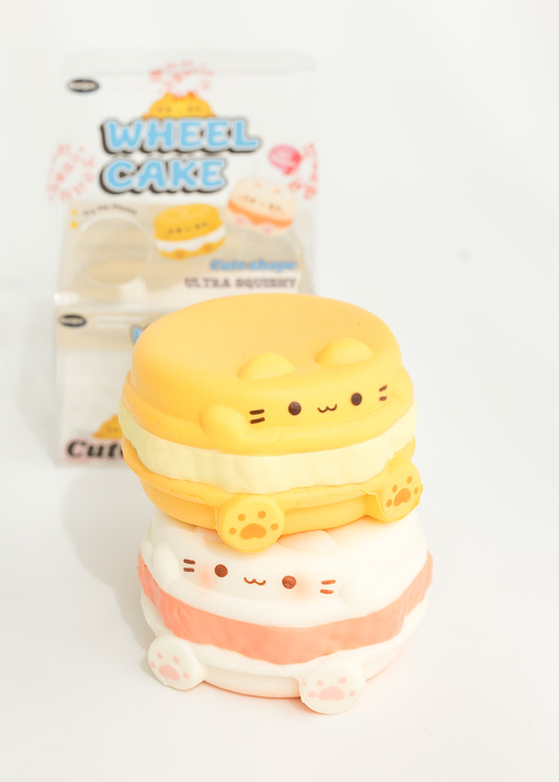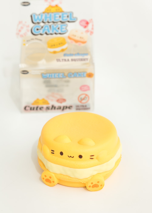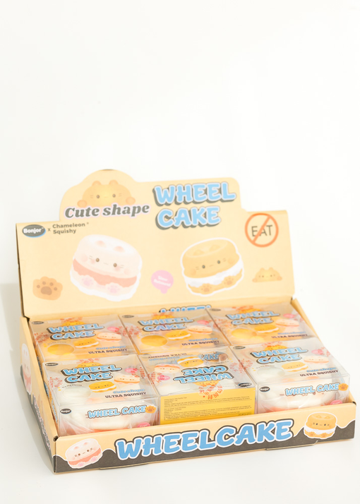 CAJA POR 6 UNIDADES DE SQUISHY EN FOMRA DE RUEDA DE TORTA CON AROMA CON CAJA DE PVC INDIVIDUAL. VIENE EN DOS COLORES.