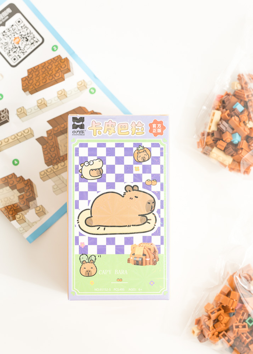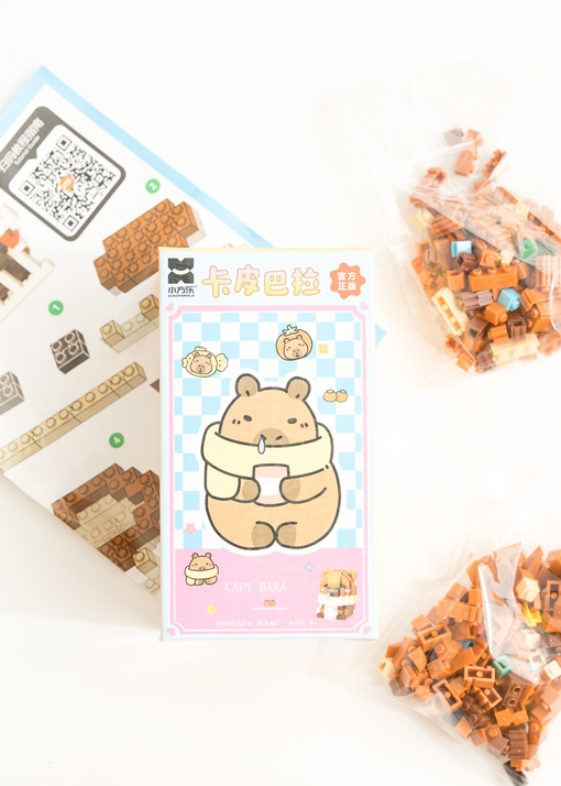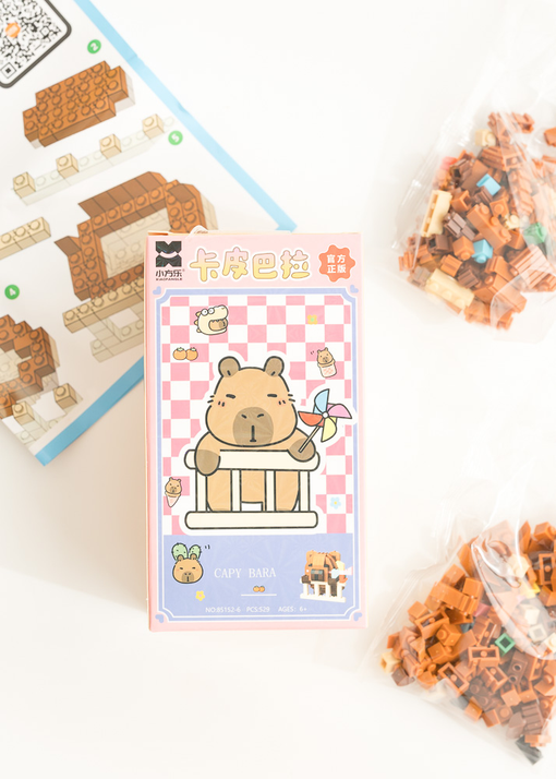 CAJA POR 12 CAJITAS CON BLOQUES DE PLASTICO PARA ARMAR. VIENEN DISEÑOS SURTIDOS DE CAPYBARA.