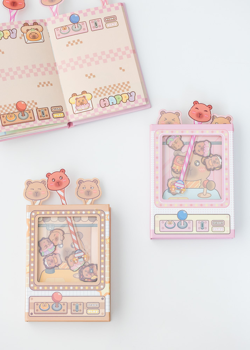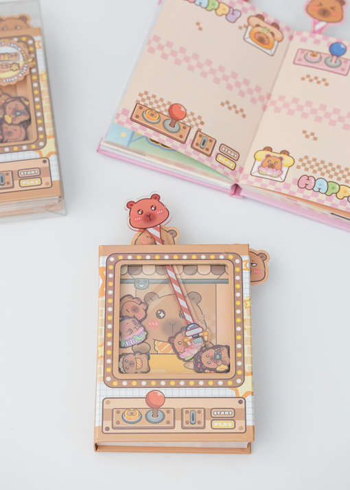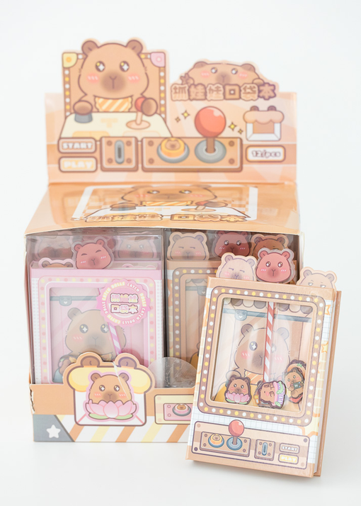 CAJA POR 12 UNIDADES DE ANOTADORES CON DISEÑOS CAPYBARA EN CAJITAS DE PVC.