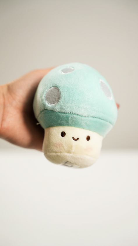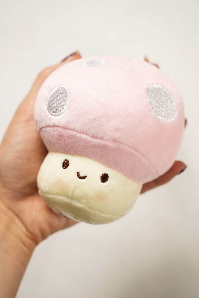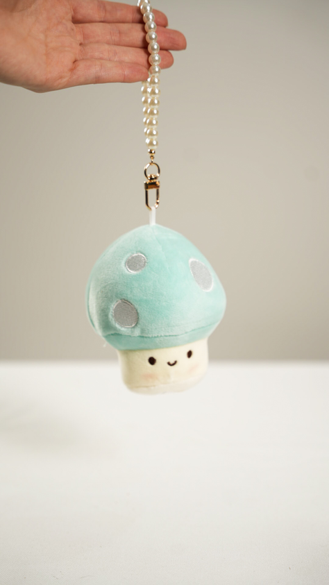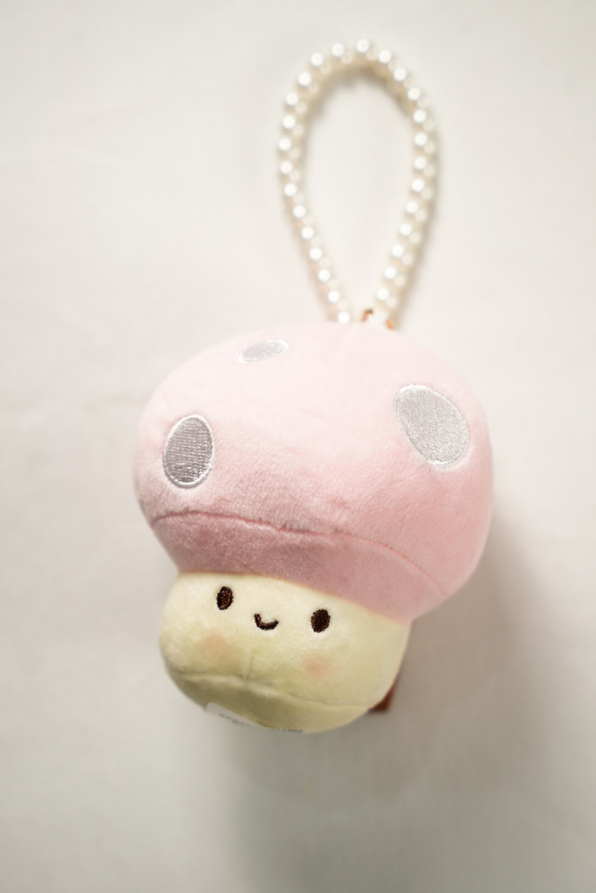 PELUCHE EN FORMA DE HONGO CON STRAP DE PERLAS. VIENE EN COLOR ROSA Y CELESTE.