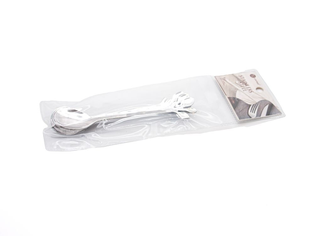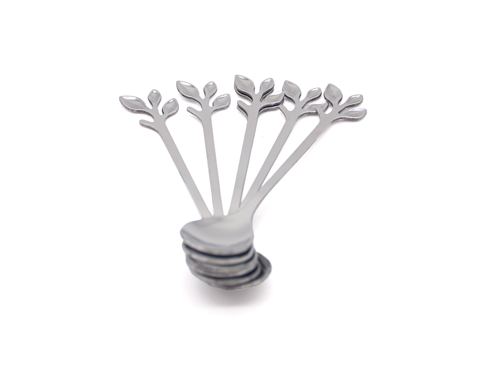 SET POR 6 UNIDADES DE CUCHARITAS DE METAL CON DISEÑO HOJITA. VIENE EN COLOR PLATEADO.