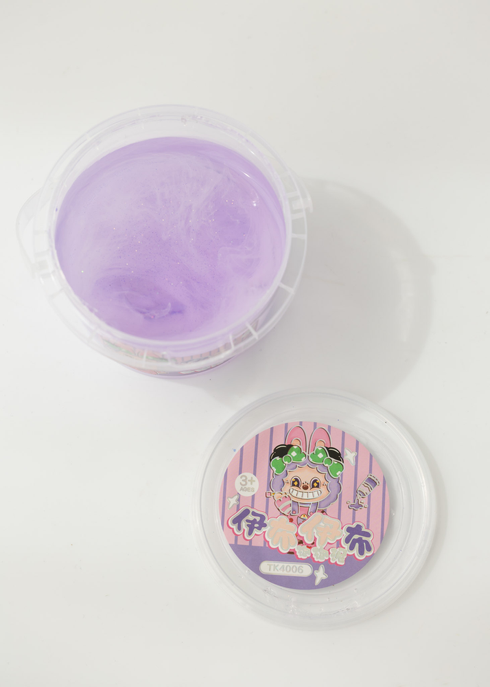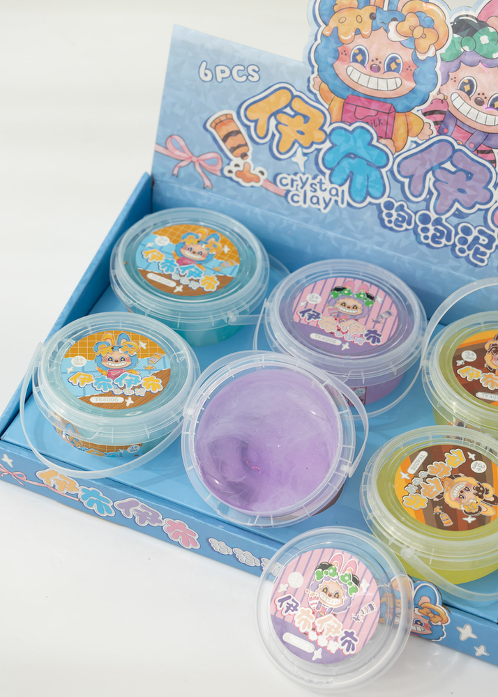 CAJA POR 6 UNIDADES DE SLIME CRISTAL EN BALDES PLASTICOS CON DISEÑOS SURTIDOS.