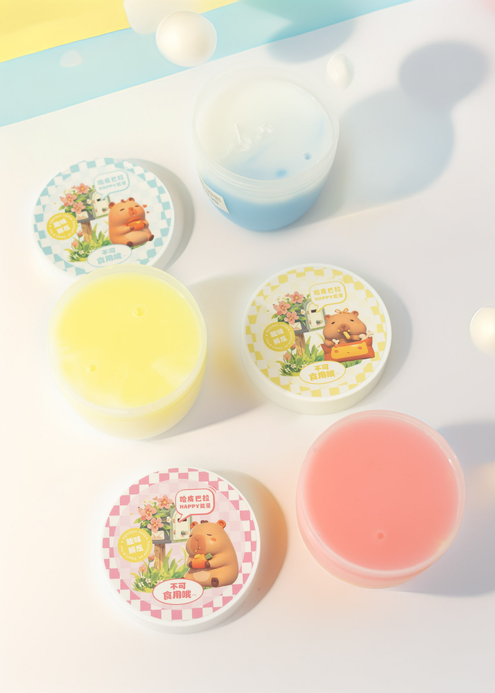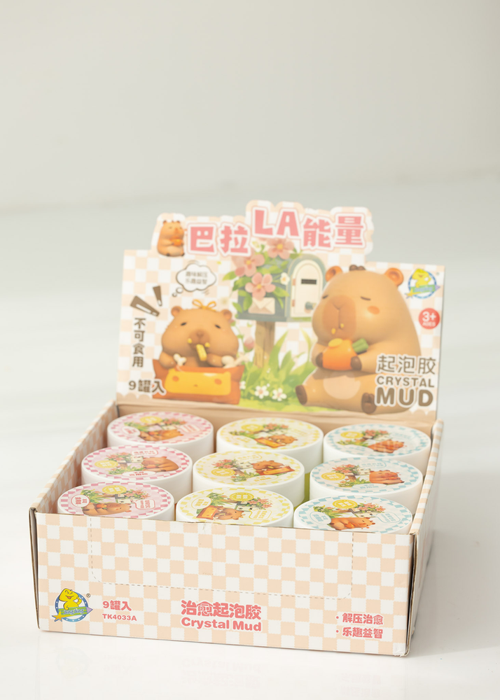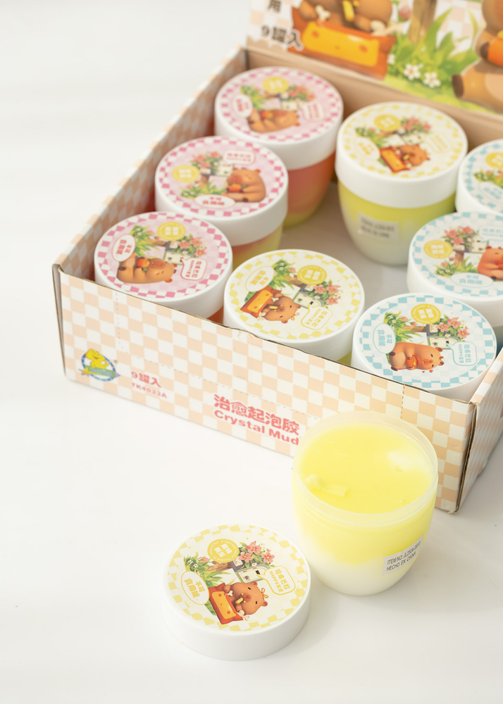 CAJA POR 9 UNIDADES DE SLIMES DE COLORES EN FRASCOS DE PLASTICO CON TAPA A ROSCA. VIENE SURTIDOS DE COLORES.