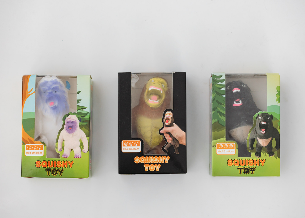CAJA POR 8 UNIDADES DE SQUISHY EN FORMA DE GORILA. VIENEN 3 MODELOS.