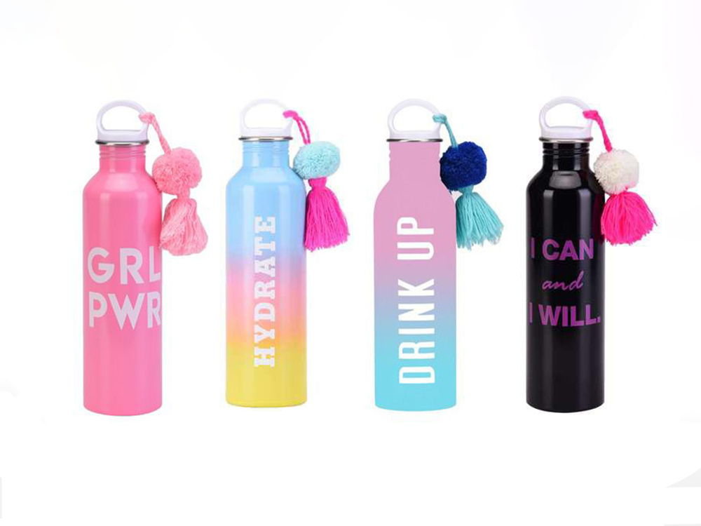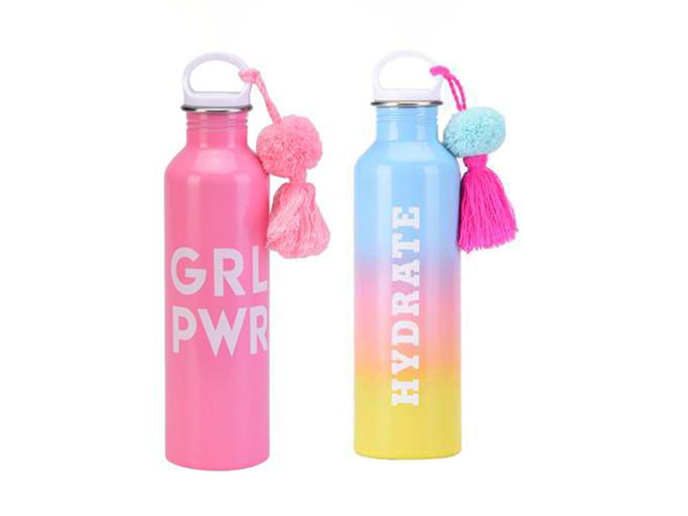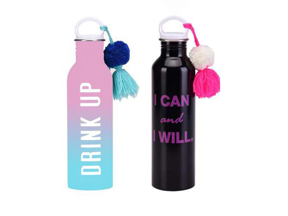 BOTELLA DE METAL CON POMPONES Y TAPA A ROSCA. VIENE EN 4 COLORES.