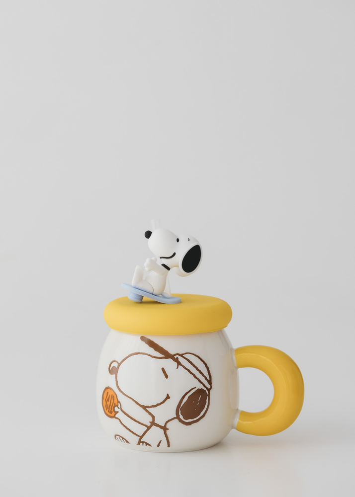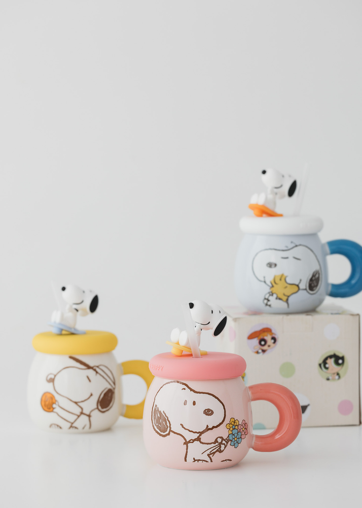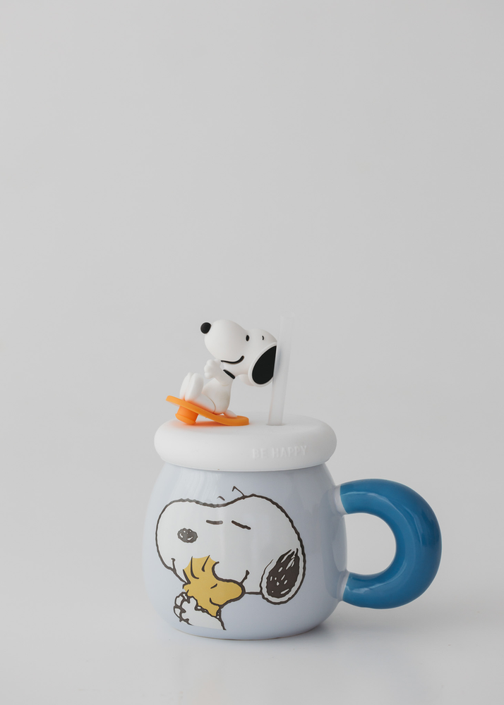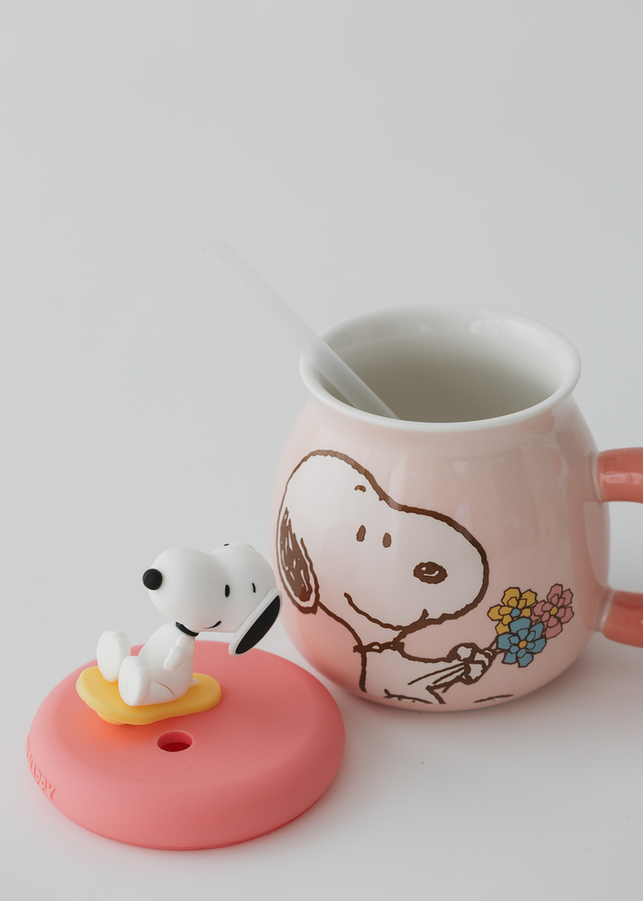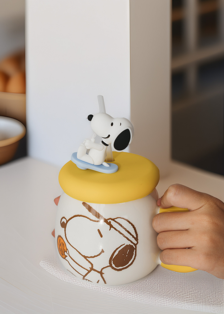 TAZA DE CERAMICA CON ASA DE SNOOPY. VIENE CON TAPA DE SILICONA Y SORBETE. SE VENDE EN 3 COLORES SURTIDOS.