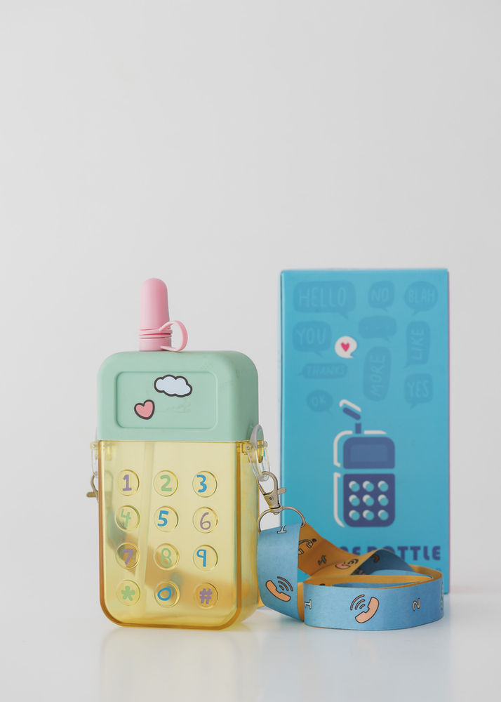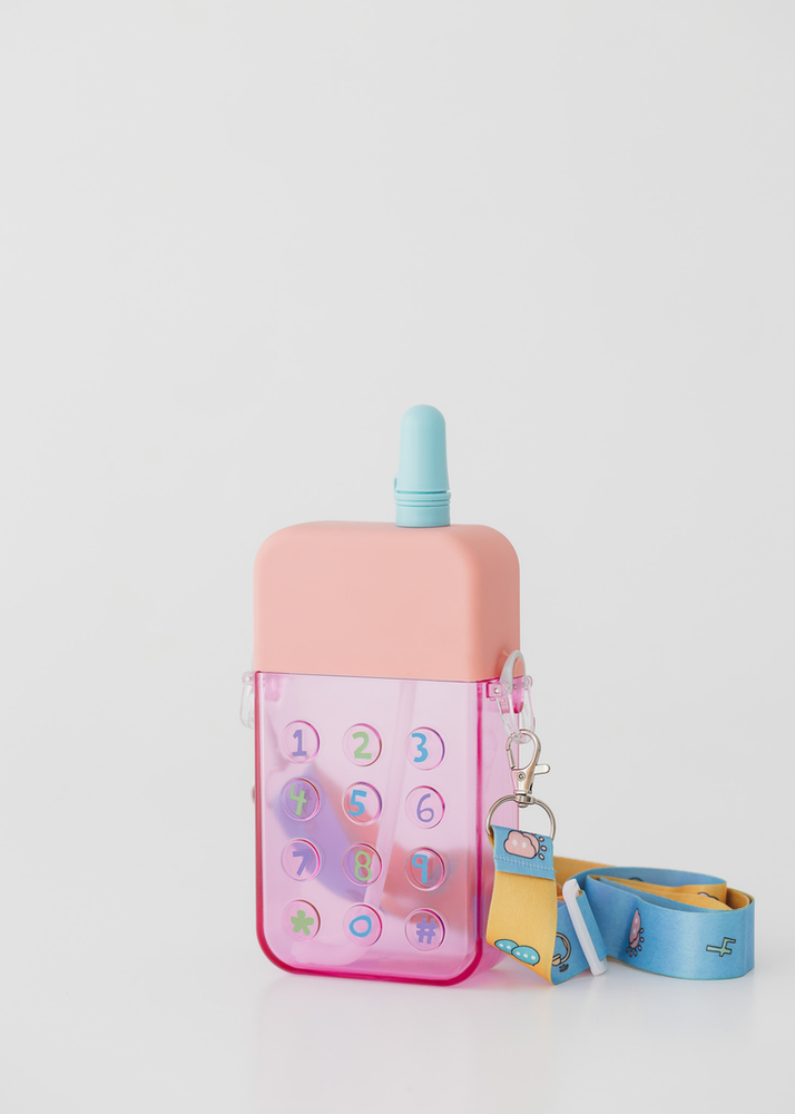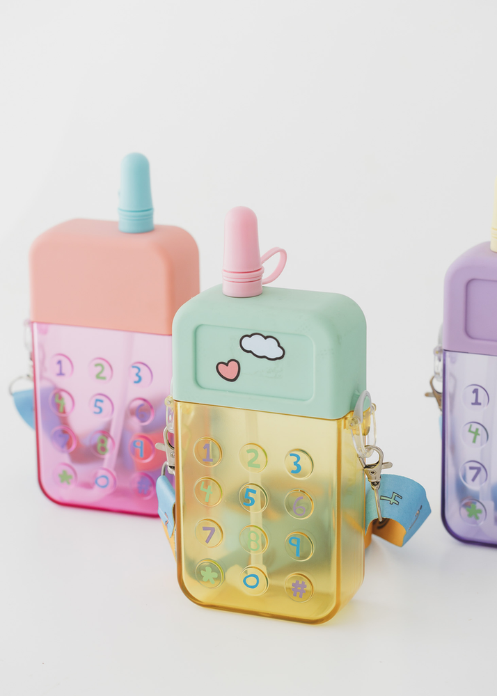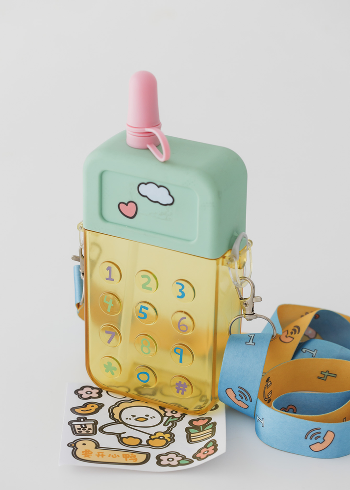 BOTELLA EN FORMA DE CELULAR CON CORREA Y STICKERS PARA DECORAR. VIENE EN 3 COLORES.