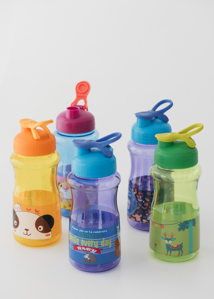 BOTELLA PLASTICA TRANSPATENTE CON PICO Y MANIJA. VIENE EN 4 COLORES.