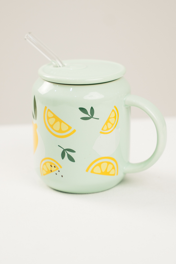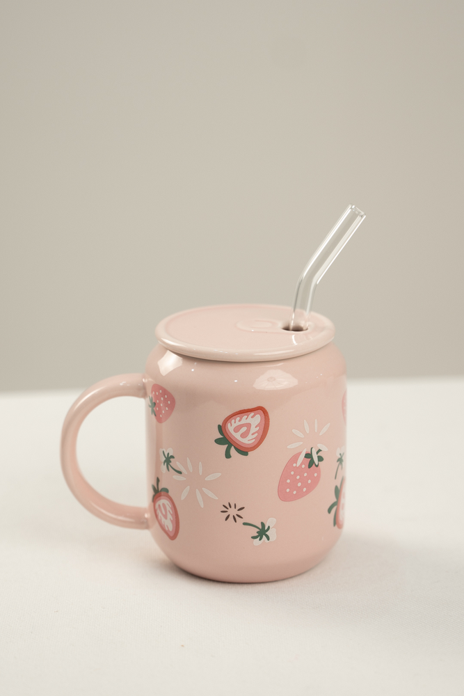 TAZA DE CERAMICA CON TAPA Y SORBETE DE VIDRIO. VIENE EN 3 COLORES CON DISEÑOS DE FRUTAS.