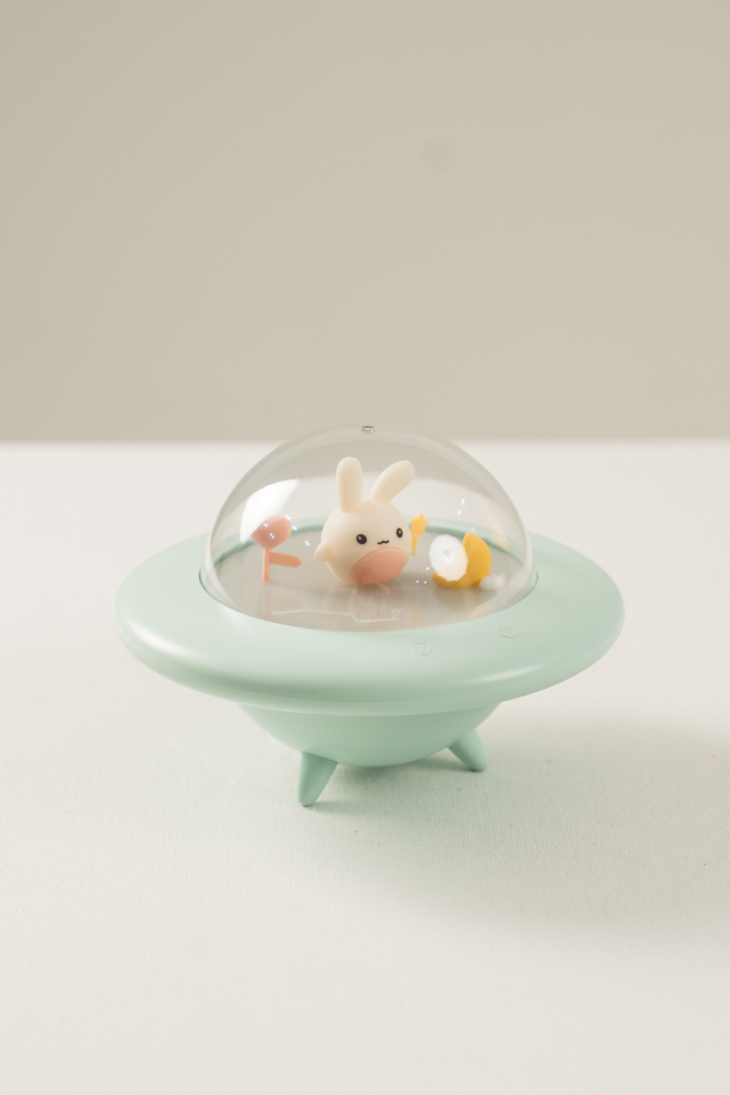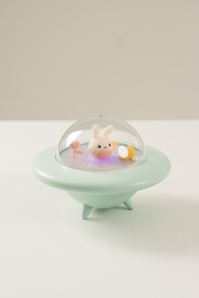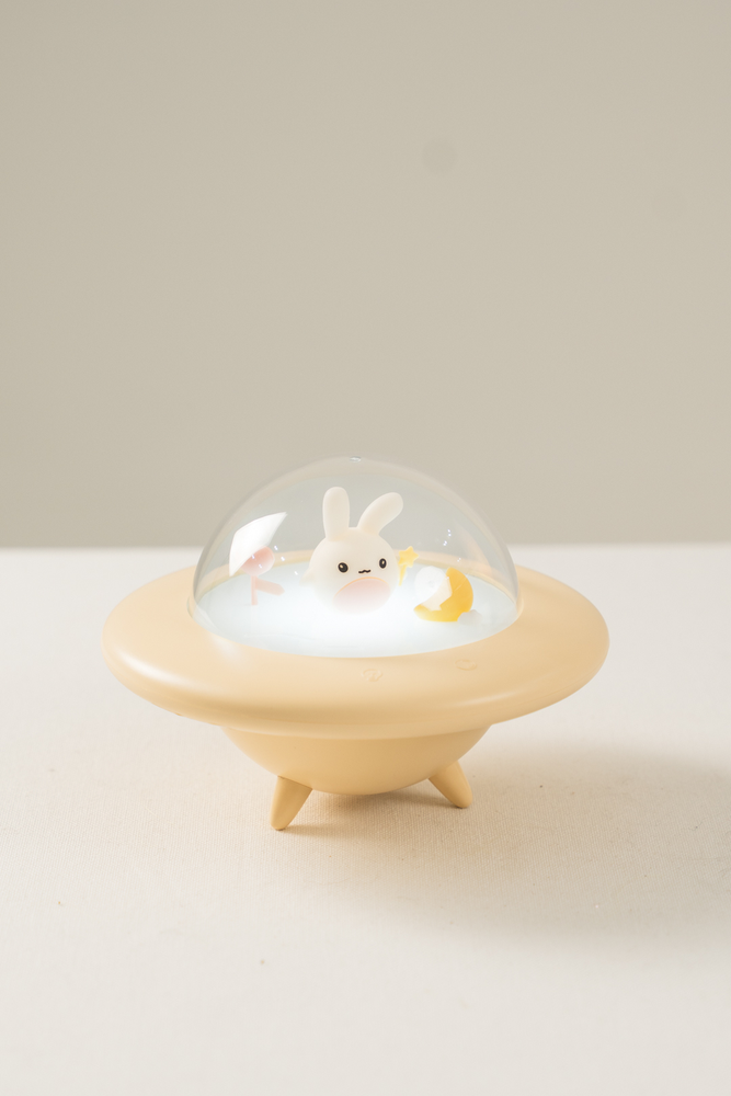 LAMPARA EN FORMA DE NAVE ESPACIAL CON LUZ Y UN CONEJITO EN SU INTERIOR. SE CARGA CON CABLE USB. VIENE EN DOS COLORES.