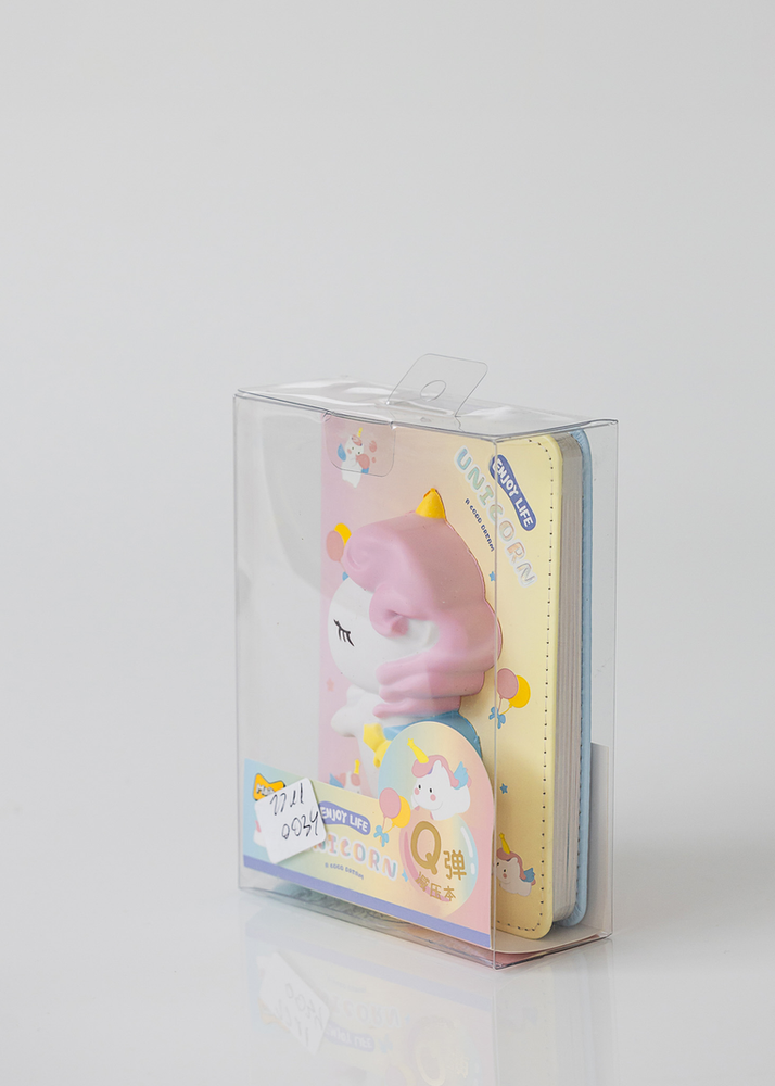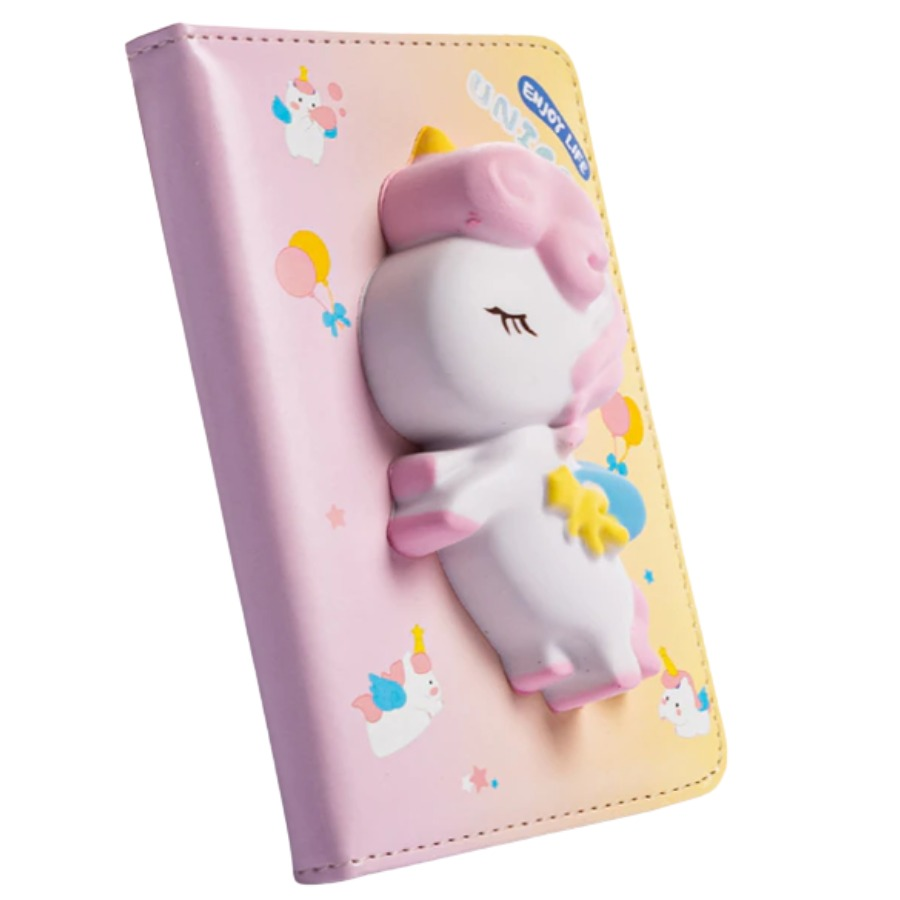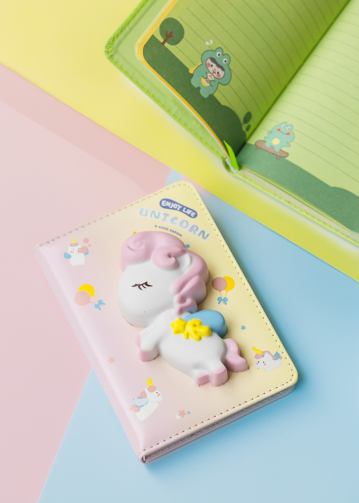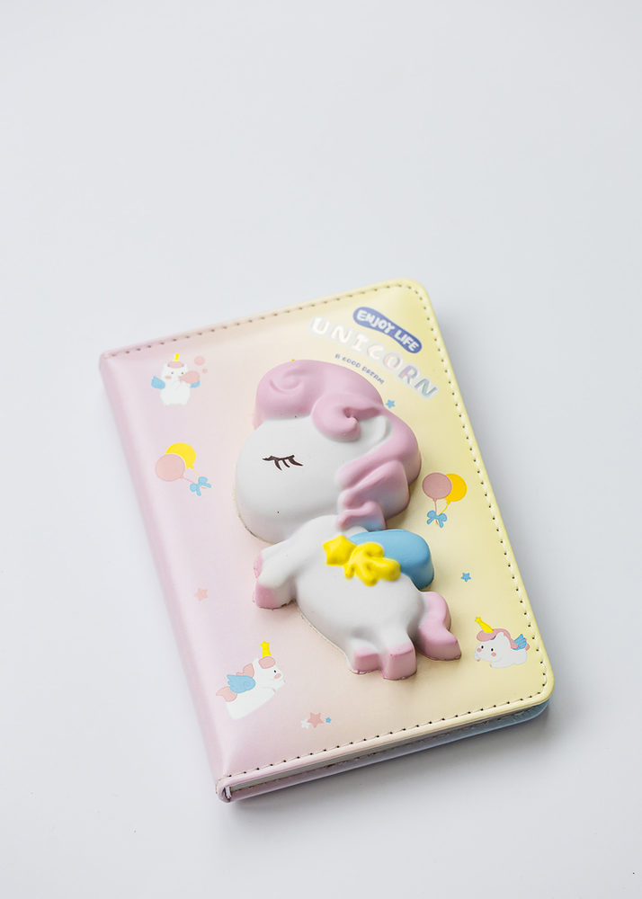 ANOTADOR A6 CON UN SQUISHY EN SU TAPA EN FORMA DE UNICORNIO. TODAS LAS HOJAS TIENEN DISTINTOS DISEÑOS. VIENE EN PACKAGING DE PLASTICO.