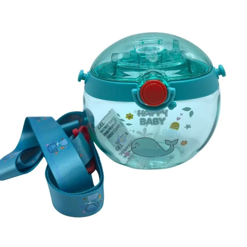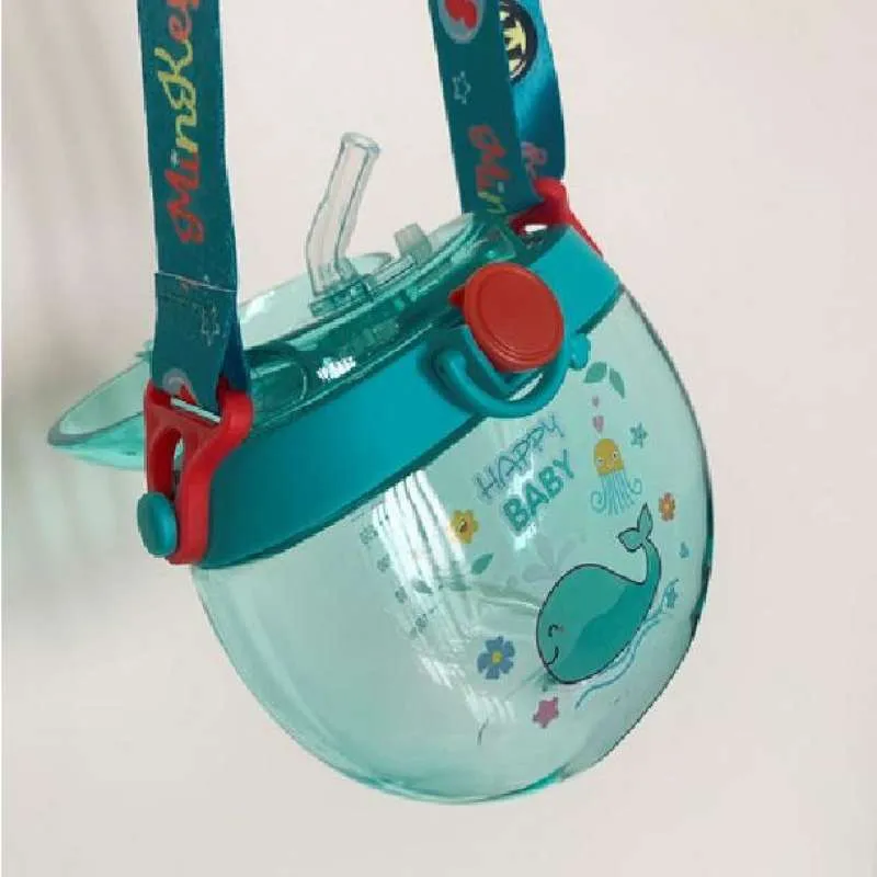 BOTELLA CANTIMPLORA CON PICO DE SILICONA Y CORREA DE TELA.