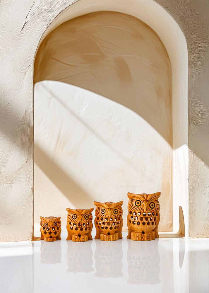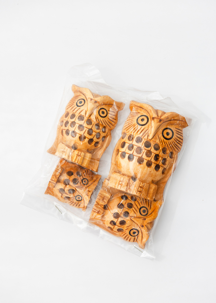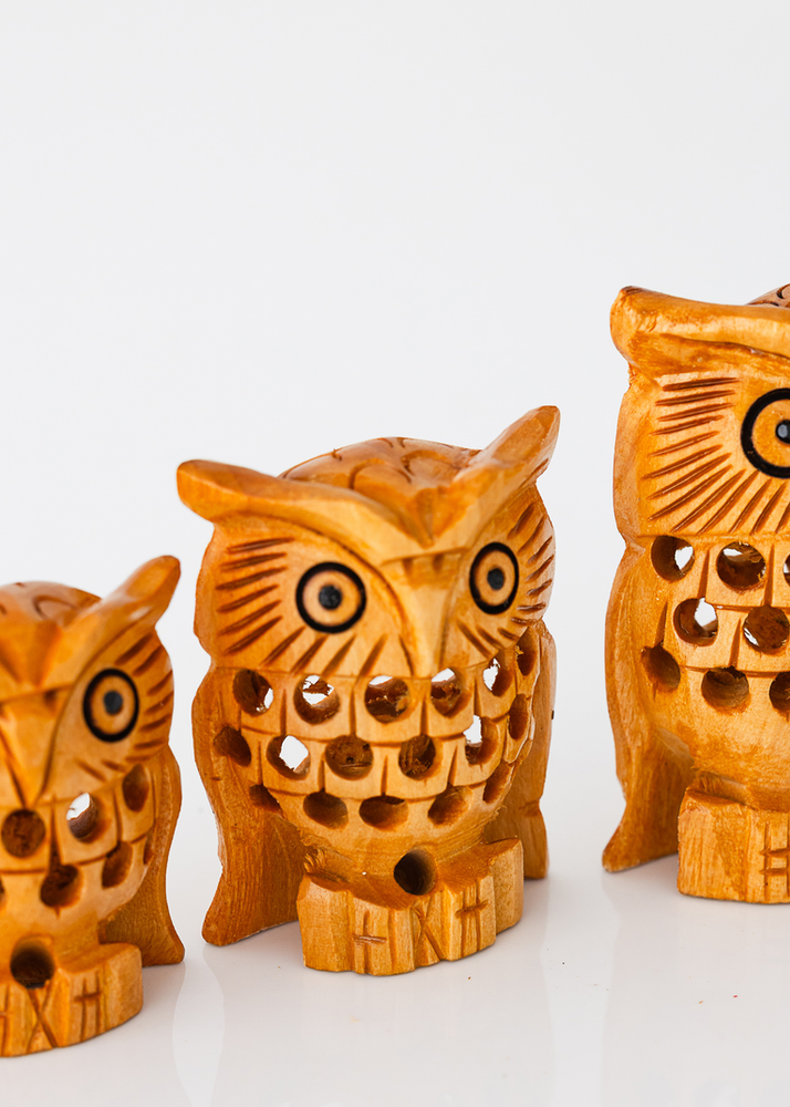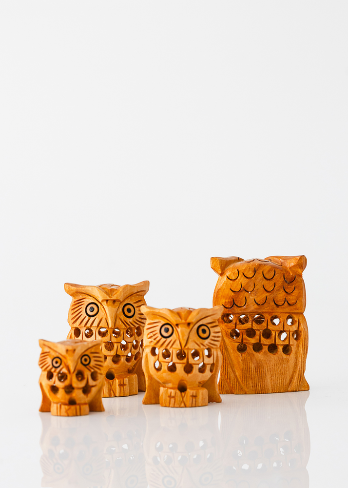 SET POR 4 UNIDADES DE BUHOS CALADOS DE MADERA. UNICO COLOR.