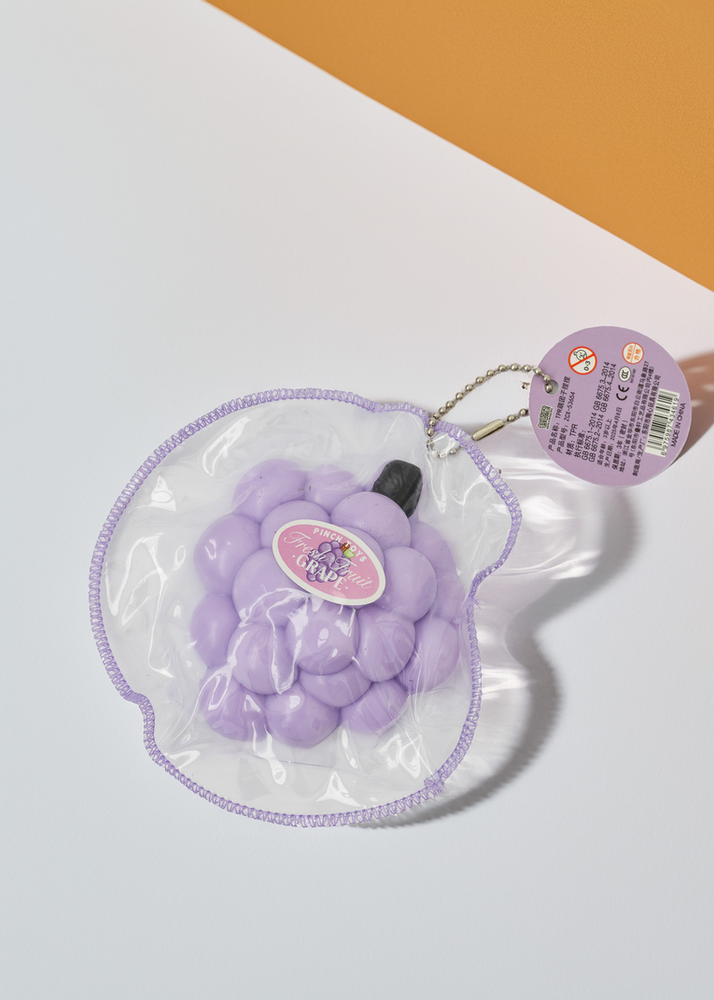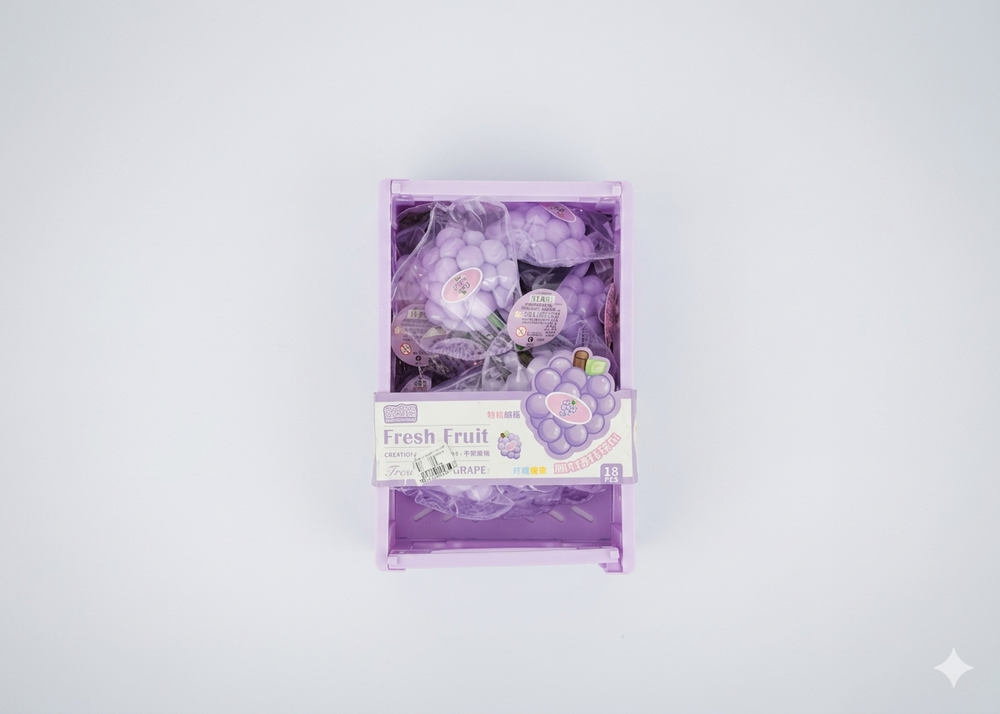 CAJA PLASTICA POR 18 UNIDADES DE SQUISHIES EN FORMA DE UVA CON AROMA FRUTAL. UNICO COLOR.