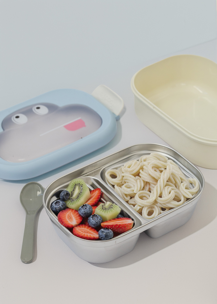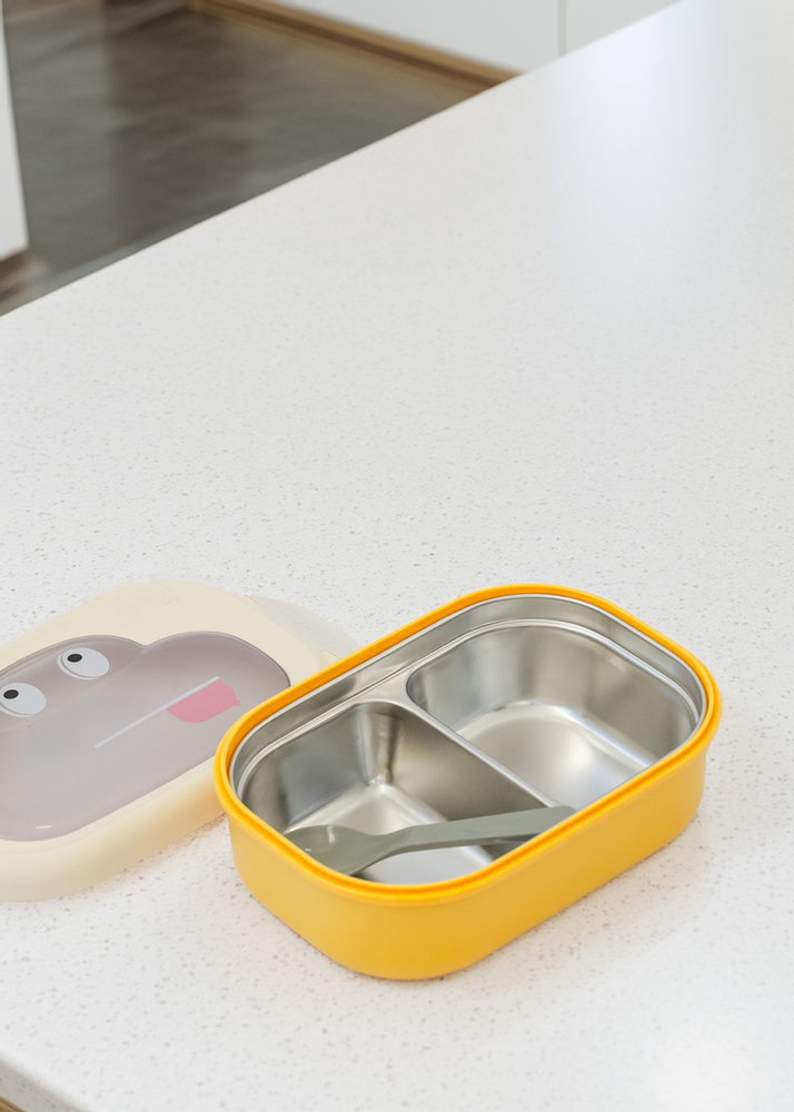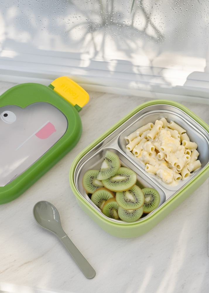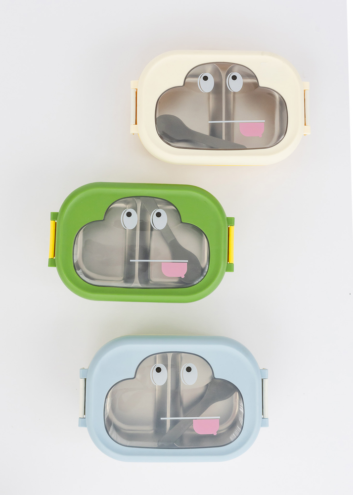 LUNCHERA METALICA DISEÑO RANA CON DOS DIVISIONES Y UNA CUCHARA.