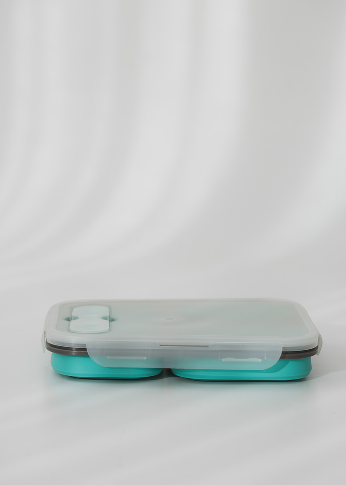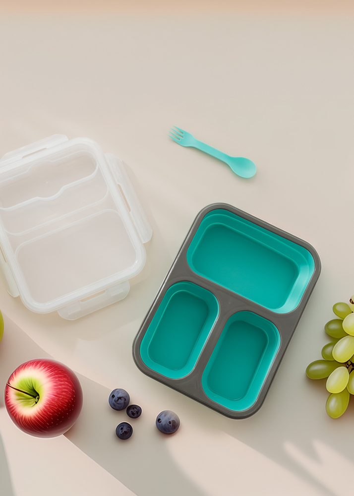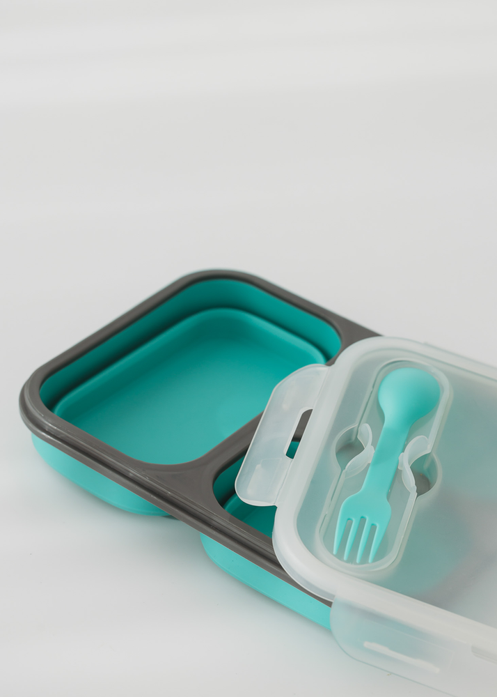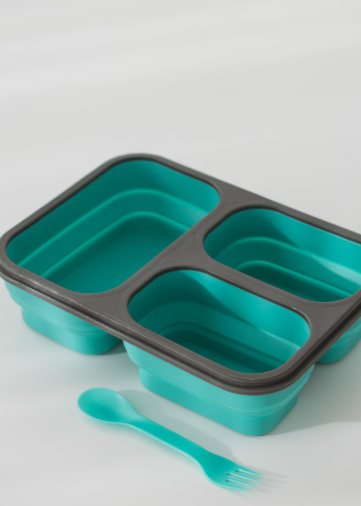 CONTENEDOR DE SILICONA PLEGABLE CON TAPA. 3 TAMAÑOS Y CON CUBIERTO. VARIOS COLORES.