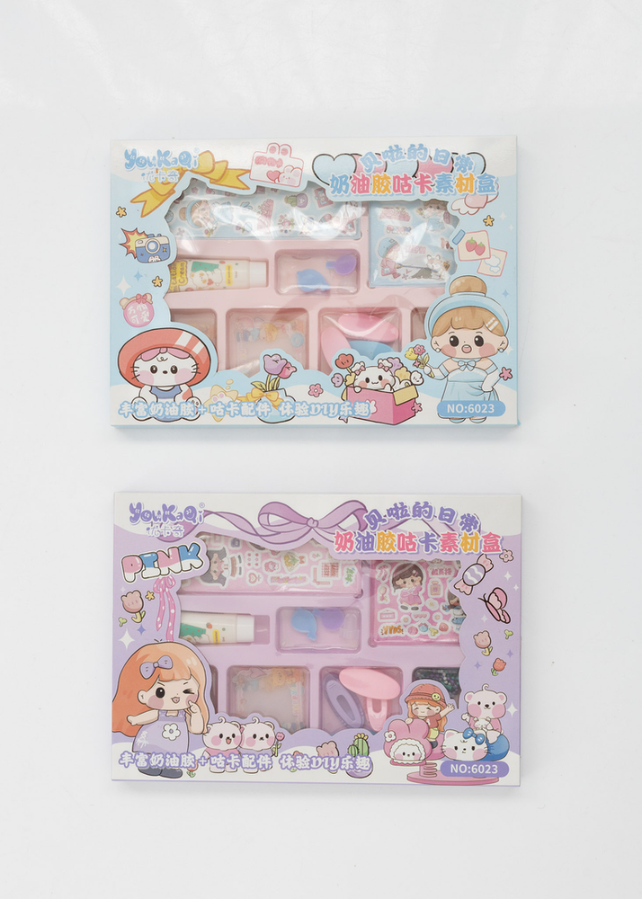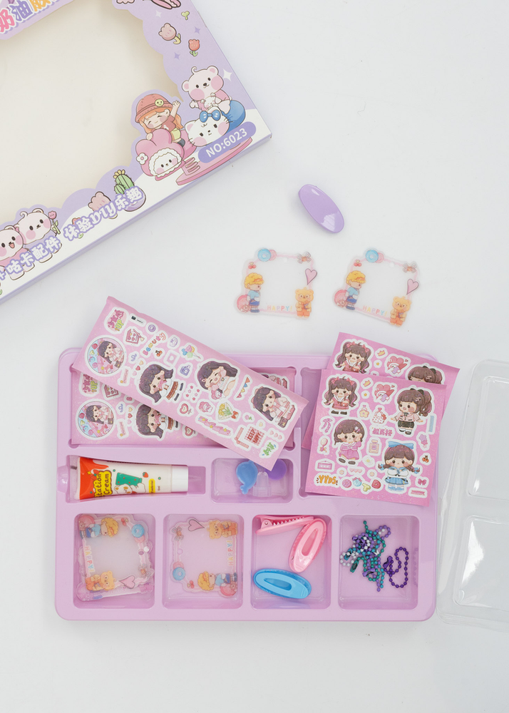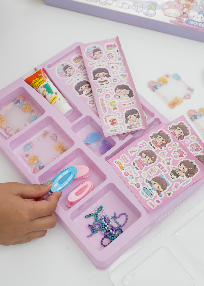 SET DIY DE ARTE. DIFERENTES. COLORES: ROSA Y CELESTE. CONTIENE: STICKERS, HEBILLAS, PINS, ADHESIVO, DIJES.