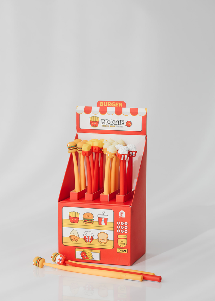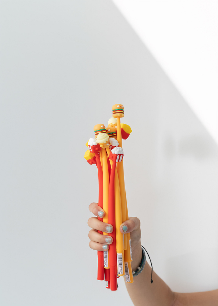 CAJA X 24 LAPICERAS DE GEL DE SILCONA, FLEXIBLES EN LA PARTE SUPERIOR. DISEÑO FAST FOOD.
